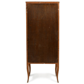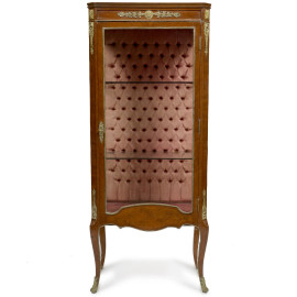 Mobile vetrina impiallacciato in satinwood con applicazioni in bronzo dorato. Interno foderato in tessuto rosso con ripiani in vetro, XX secolo, cm 149x61x40, (usura del tempo)