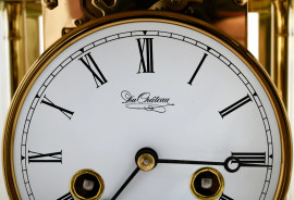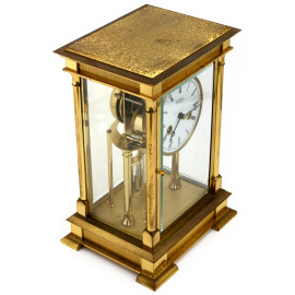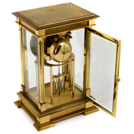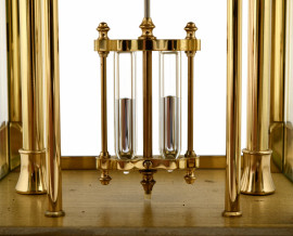 Orologio cappuccina a pendolo a tersione in bronzo dorato con quandrnate circolare smaltato con numeri romani Du Chateau, cm 29x18,5x15, (da revisionare)
