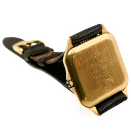 Orologio da donna "Kienzle Gold" al quarzo con cassa in oro 18 Kt e cinturino in pelle nera, diametro cassa cm 3, lunghezza cm 22, (lievi segni di usura del tempo, meccanismo da revisionare; sul retro della cassa dedica incisa)