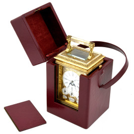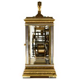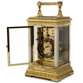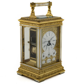 Orologio da tavolo La Vallèe calendario e ripetizione in bronzo cesellato con inserti in madreperla e quadrante in porcellana con calendario completo e fasi lunari con numeri romani, cm 23,5x12x10, (da revisionare)