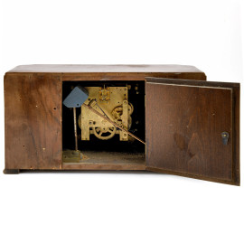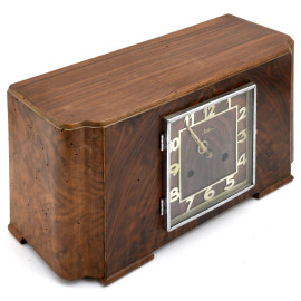 Orologio Fung da tavolo in legno impiallacciato in radica , XX secolo, cm 19,5x37x14, (da revisionare)