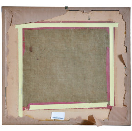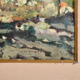 Paesaggio con albero e case, olio su tela, cm 48x52 compreso passepartout, firmato e dataato 1937 in basso a destra, entro cornice, (ondulazioni della tela e sollevamenti di colore)