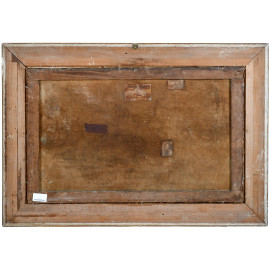Passeggiata sul sentiero, olio su tela, XIX secolo, cm 56x89,5, entro cornice, (rotture e fessurazioni della tela, cadute di colore)