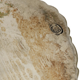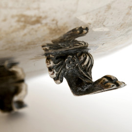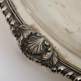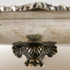 Piatto centrotavola circolare in argento con orlo cesellato, poggiante su quattro piedini ferini, altezza cm 4, diametro cm 32,5, peso gr. 960