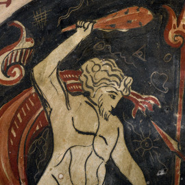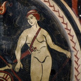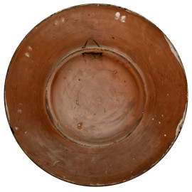 Piatto decorativo in terracotta, dipinto in stile greco antico, XX secolo, diametro cm 51, (segni di usura del tempo, sparute lacune dello strato pittorico)