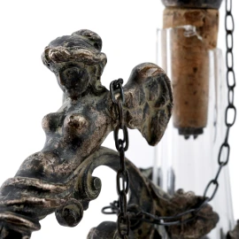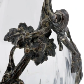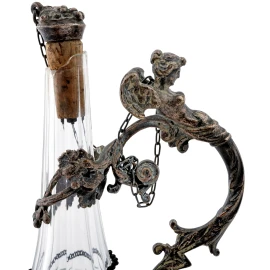 Piccola bottiglia in vetro e metallo argentato con presa finemente cesellataa con figura alata e tralcio d'uva lungo la struttura, altezza cm 24,5(rottura alla bottiglia, segni di usura)