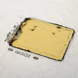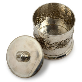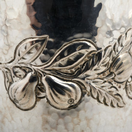 Porta bonbon in argento 800/000 Mugnai sbalzato con festone di frutta lungo la circonferenza, punzone 418FI, cm 13,5x 10,5, peso gr 300