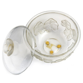 Portabonbon con coperchio e presa a foggia di fiore in cristallo e foglie a rilievo, XX secolo, cm 12x15
