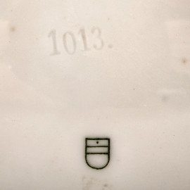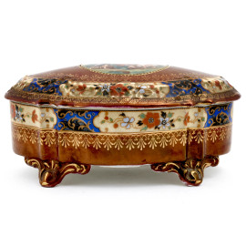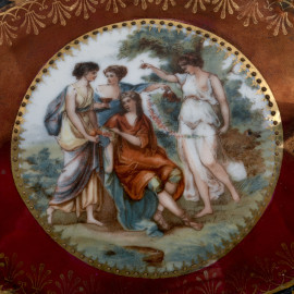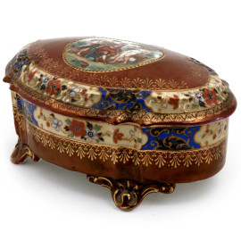 Portagioie in porcellana di assetto ovale, con decorazioni policrome su fondo bordeaux, scena mitologico-cortese sul coperchio,Austria, XX secolo, cm 9x22x15