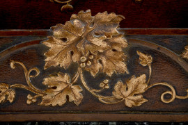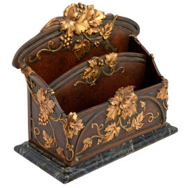 Portalettere in bronzo brunito con decori a rilievo a tralci d'uva dorati, firmato al lato. Base in marmo. XX secolo, cm 17x19x9,5