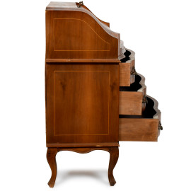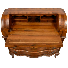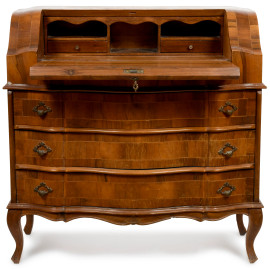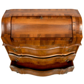Ribalta a fronte mosso scandito da tre cassetti e un piano a ribalta celante vano scrittoio scandito da vani e cassetti, XX secolo, cm 99x96,5x40, (segni di usura)