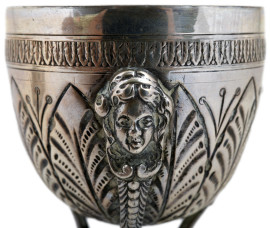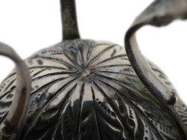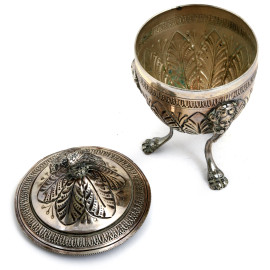 Salierina in argento cesellato con presa a foggia di pappagallo e tre piedi ferini, altezza cm 13, peso gr 160