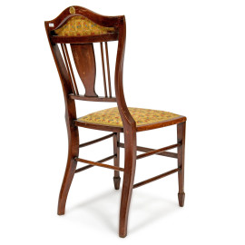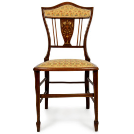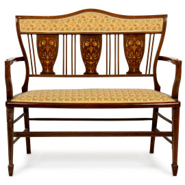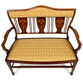 Salottino composto da divanetto e due sedie in noce intarsiato in varie essenze a motivi vegetali e grottesche. Sedute e schienali in tessuto. XX secolo. Misure divano: cm 91x96x52; Misure sedie: cm 84,5x41x41, (segni di usura, scalfiture, graffi)