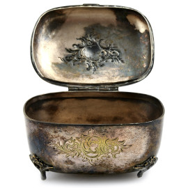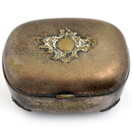 Scatola in metallo argentato poggiante su quattro piedini, XX secolo, cm 8,5x13,5x10, (segni di usura del tempo)