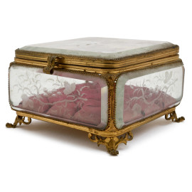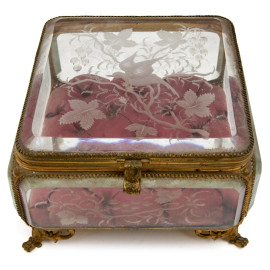 Scatola portagioie in vetro e metallo dorato poggiante su quattro piedini ferini, XX secolo, cm 10x16x17, (segni di usura)