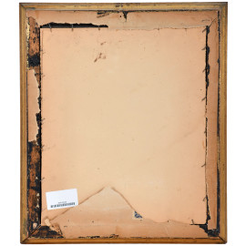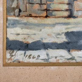 Scorcio di cortile, XIX secolo, olio su cartoncino, cm 35x30, siglato e datato 1860 in basso a sinistra, entro cornice, (ondulazione e rottura del supporto)