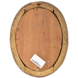Scorcio di paese con figure, XIX-XX secolo, olio su tela applicata su tavola a setto ovale, cm 26x19, entro cornice, (ondulazioni della tela)