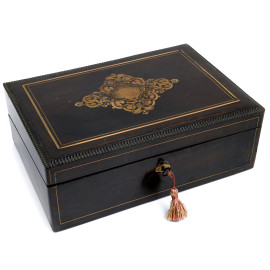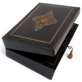 Scrittoio da viaggio in legno con decori oro sul coperchio. Rivestimento al piano in velluto. XX secolo, cm 12x32,523, (segni di usura, manccanze, graffi, macchie al piano)