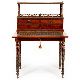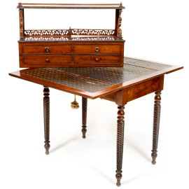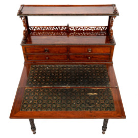 Scrittoio in mogano con corpo superiore a 4 cassetti sormontati da struttura traforata e intagliata. XIX secolo, cm 120x78,5x51,5 (aperto 102,5), (segni di usura, restauri e rotture)