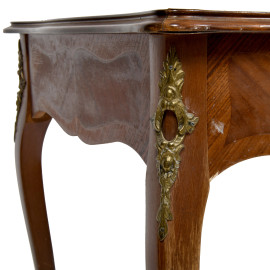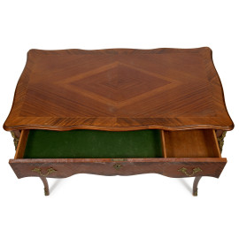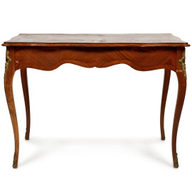 Scrivania impiallacciata in satinwood dal profilo mosso e inserti bronzei con cassetto al fronte e gambe mosse. XX secolo, cm 74,5x101x60, (scalfiture, usura del tempo)