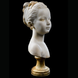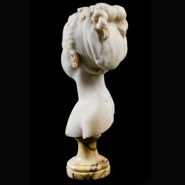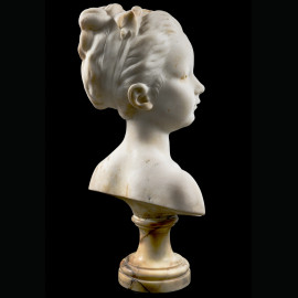 Scultura in marmo zuccherino raffigurante busto di fanciulla su base in marmo, XIX secolo, altezza cm 44 (difetti, rotture alla base)