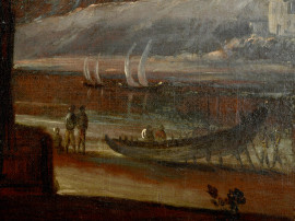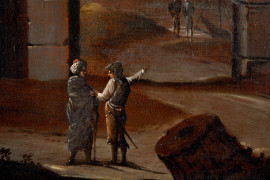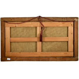 Scuola Romana del XVIII secolo, Paesaggio con architetture e rovine, olio su tela, cm 63,5x126 entro cornice