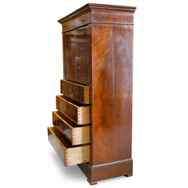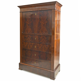 Secretaire impiallacciato in piuma di mogano con quattro cassetti in colonna al fronte e piano scfittoio a ribalta , XIX secolo, cm 185x114x51,5 (segni di usura, graffi)