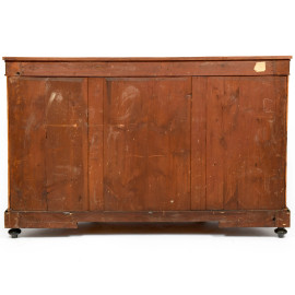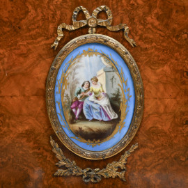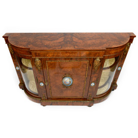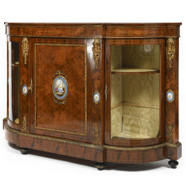 Servante impiallacciata in radica con filettature in bosso e inserti in bronzo dorato. Ante laterali vetrate convesse affiancanti sportello centrale caratterizzato da cammeo in ceramica dipinta con scena galante entro cornice a festoni in bronzo, XX secolo, cm 112x167,5x41,5, (piccoli segni di usura) [..]