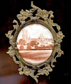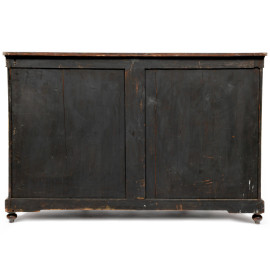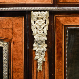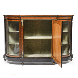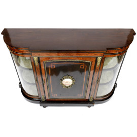 Servantina impiallacciata e intarsiata in varie essenze con sportello centrale afffiancato da coppia di sportelli convessi a vetrina, medaglione centrale in ceramica con scorcio di paesaggio e inserti bronzei. XX secolo, cm 104x150x36,5, (graffi, scalfiture, difetti)