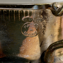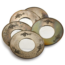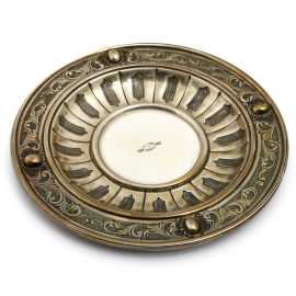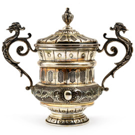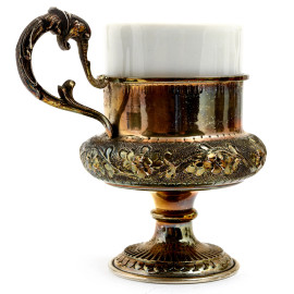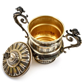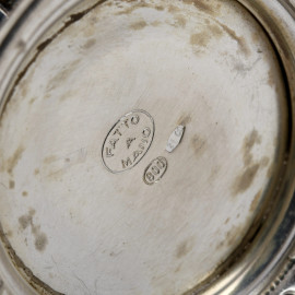 Servizio da caffè composto da sei portatazzine e relativi piattini in argento finemente cesellati, da sei tazzine in porcellana Heinrich (quattro con bordo dorato) e da una zuccheriera in argento finemente cesellato e interno vermeil. Punzone 21 CO, misure cm 12x13,5, peso complessivo gr 1100