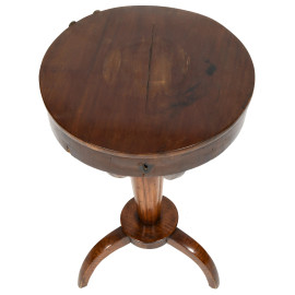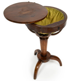 Tavolinetto da lavoro impiallacciato in mogano con piano circolare rotabile celante vano contenitore in tessuto entro archi lignei su fusto conico terminante in base treppiede, XIX secolo, altezza cm 71,5 diametro 40,5, (segni di usura)