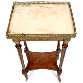 Tavolinetto impiallacciato in radica con piano in marmo rettangolare con balaustra perimetrale in lamina di bronzo traforata. Quattro gambe scanalate raccordate da piano, XX secolo, cm 76x40,5x30,5, (segni di usura, scalfiture, graffi)