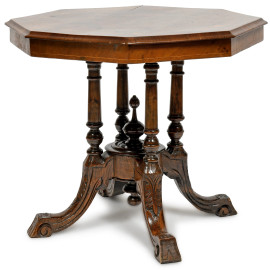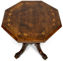 Tavolino con piano ottagonale impiallacciato in radica con intarsi in varie essenze poggiante quattro colonnine tornite raccordate da elemento circolare terminante in quattro gambe a ricciolo intagliate, XX secolo, cm 63x77 (rotture, fenditure, segni di usura)