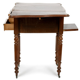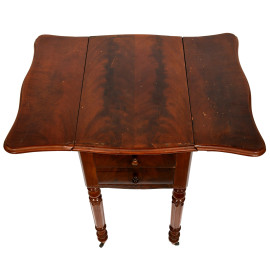 Tavolo a bandelle impiallacciato in mogano. Lati scanditi rispettivamente da due cassetti e uno sportello a ribalta. Gambe munite di rotelle. XX secolo, chiuso cm 71x37,5x52; aperto cm 71x72x52, (graffi al piano, sollevamento dell'impiallacciatura)