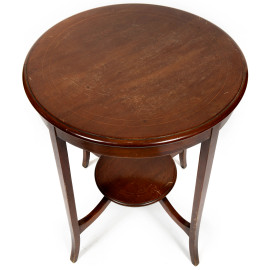 Tavolo circolare impiallacciato in mogano con gambe raccordata da traversa a croce convergente in piano circolare, XX secolo, cm 75x60, (segni di usura, scalfiture e graffi)