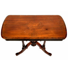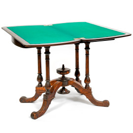 Tavolo da gioco in noce con piano intagliato e interno in velluto verde, poggiante su quattro colonnine scanalate raccordate da elemento centrale e terminante in quattro gambe a ricciolo, XX secolo, cm 68x91x44,5, (segni di usura)