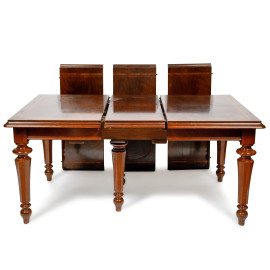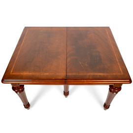 Tavolo rettangolare apribile in mogano e varie essenze con gambe tornite, cm 78x128x100, 4 prolunghe (cm 40 cad.), XIX secolo, (lievi segni di usura)