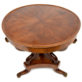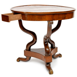 Tavolo tondo in noce impiallacciato con gambe mosse raccordate da pedana, XIX secolo, cm 79x88,5, (segni di usura)