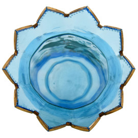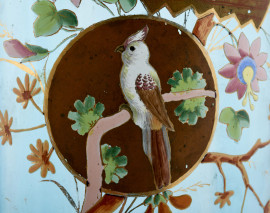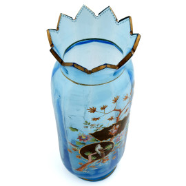 Vaso in vetro azzurro con decorazione policroma floreale, pappagallo e aratore, rifiniture in oro, Cina XX secolo, altezza cm 31,5, (cadute di colore e di doratura, segni di usura)