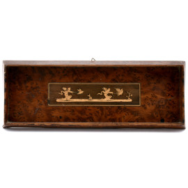 Vassoietto in legno con intarsio centrale in diverse essenze raffigurante putti su bighe trainate da volatili, XX secolo, cm 10x26,5