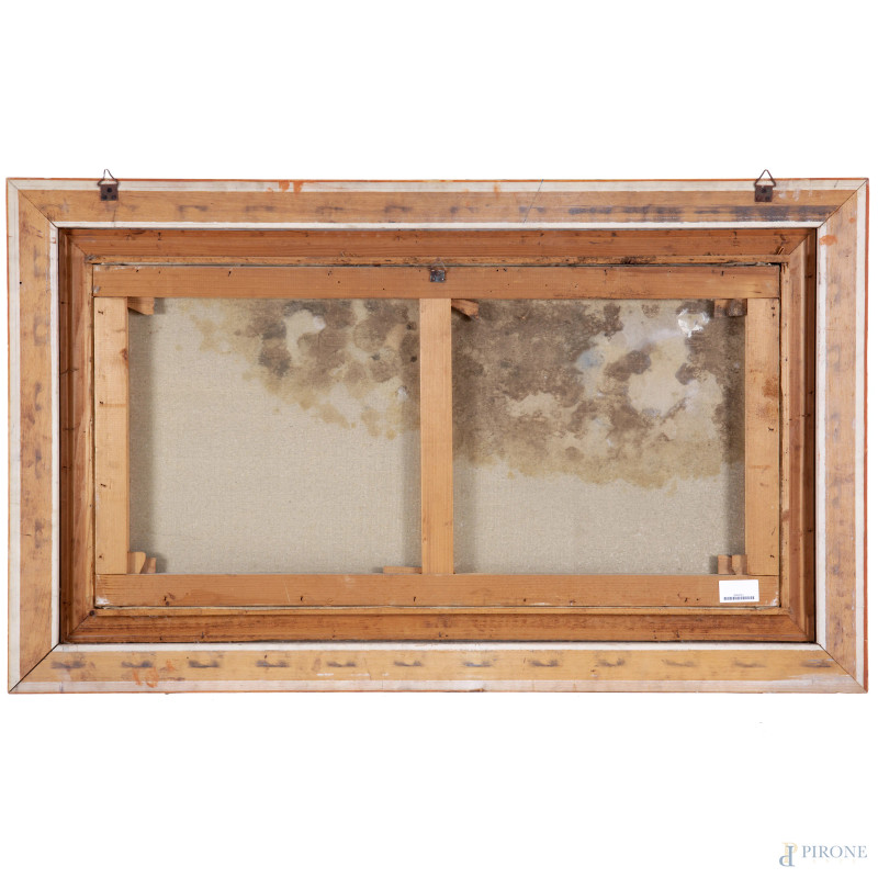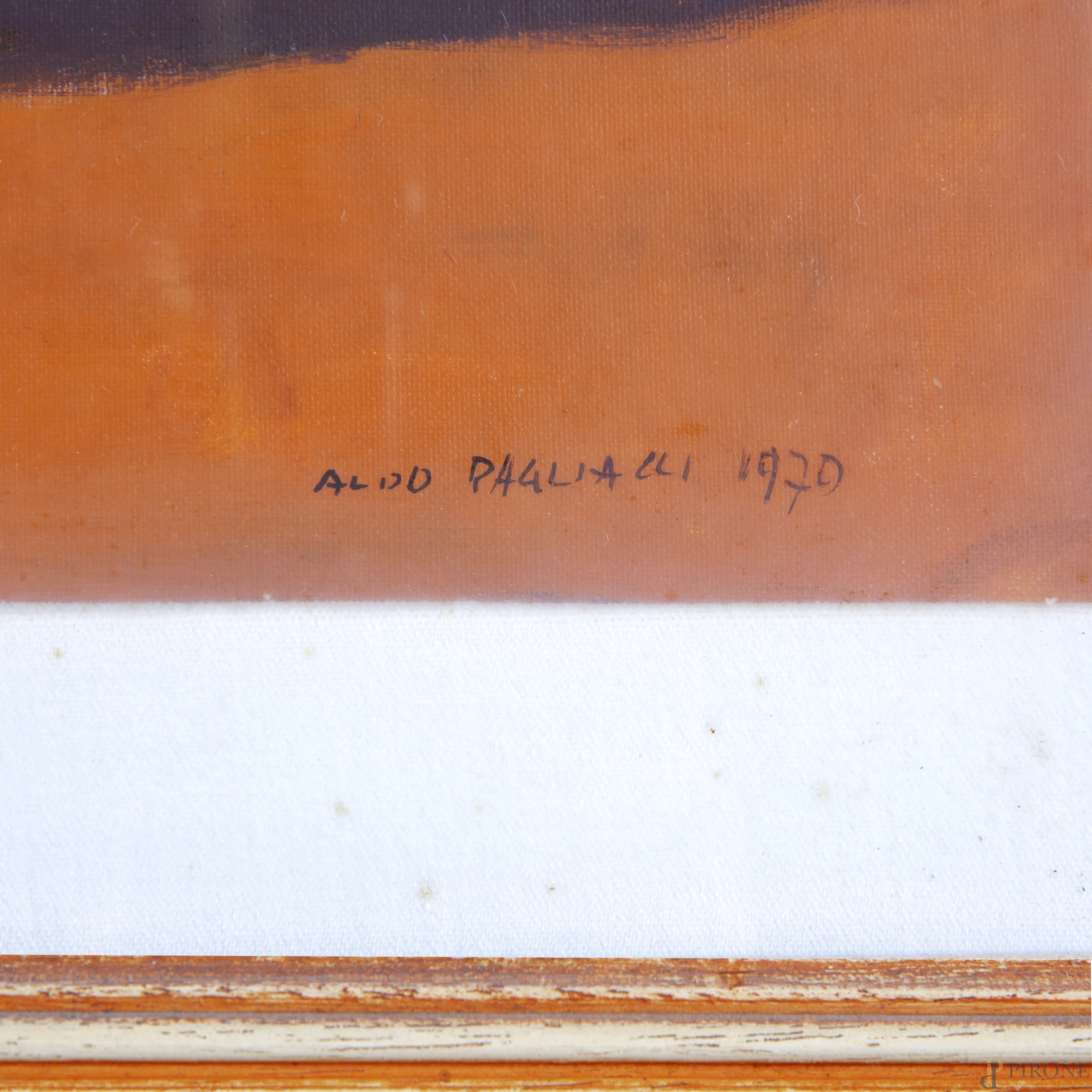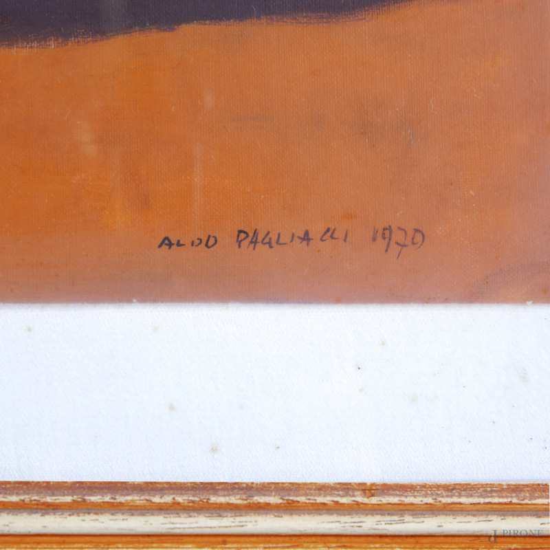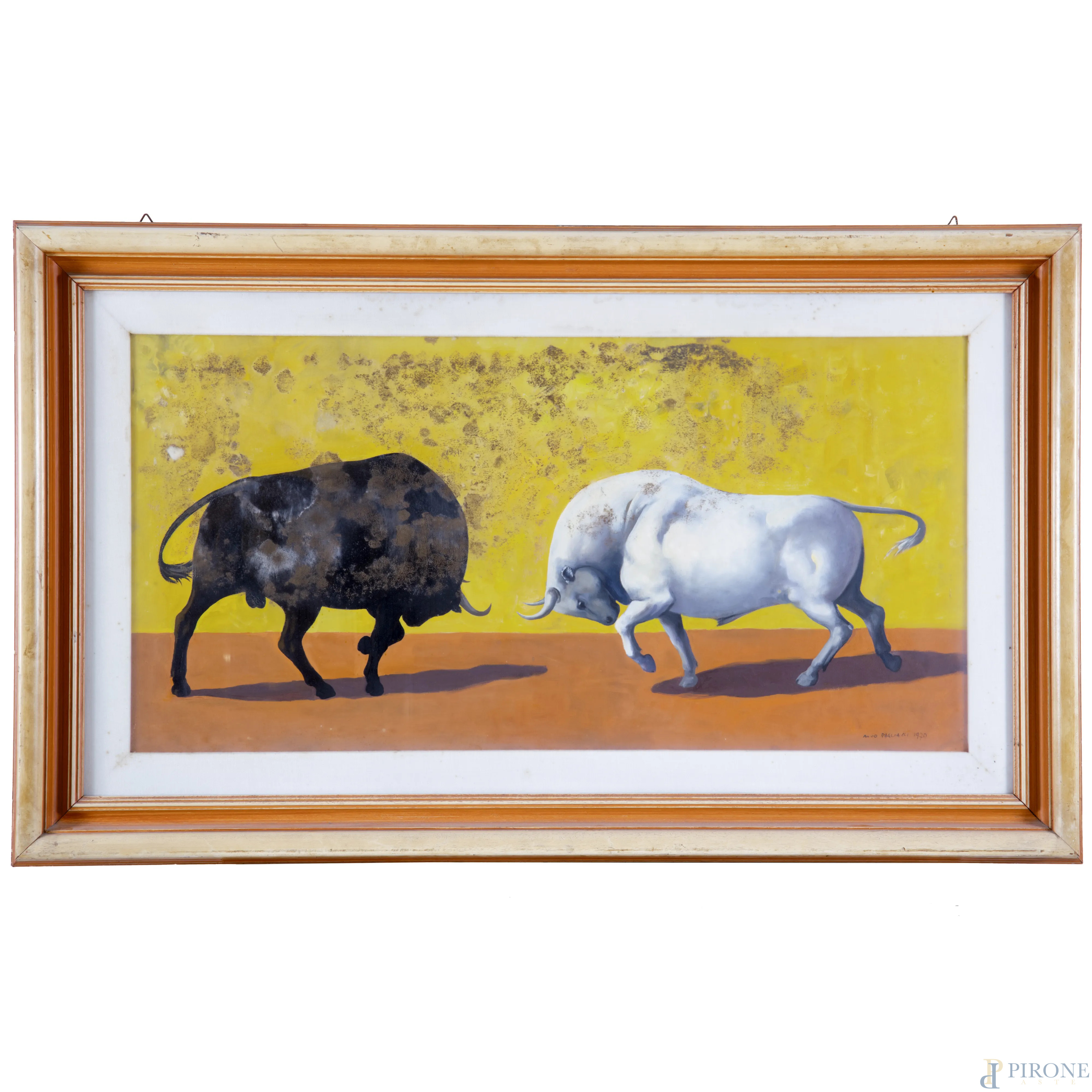 Aldo Pagliacci (1913-1991), Tori, acrilico su tela, cm 50x100, firmato e datato in basso a destra "70", entro cornice, (gravi tracce di umidità e muffa)