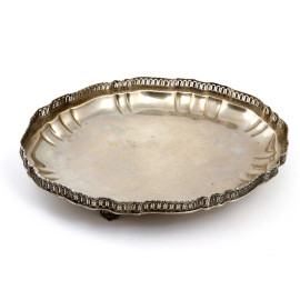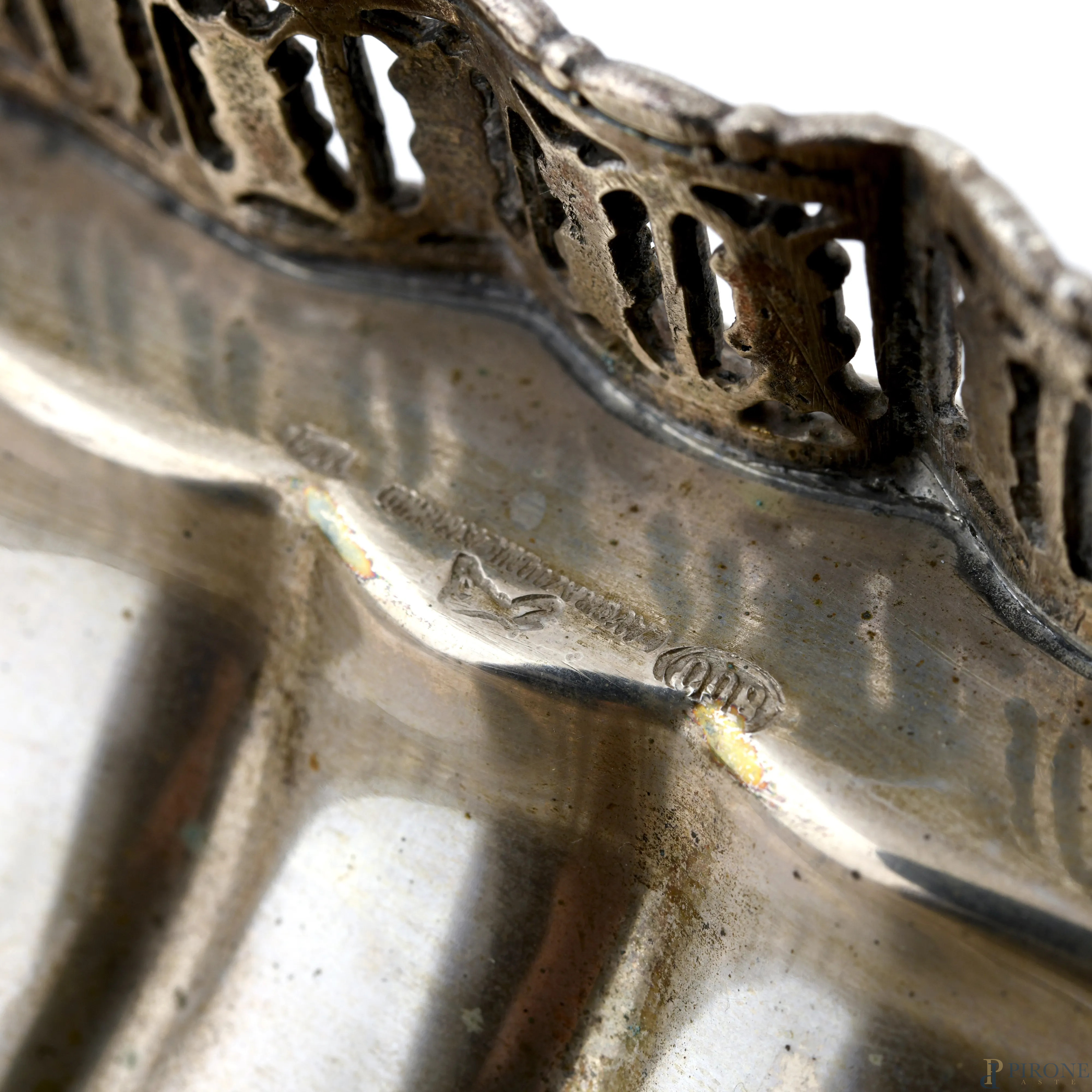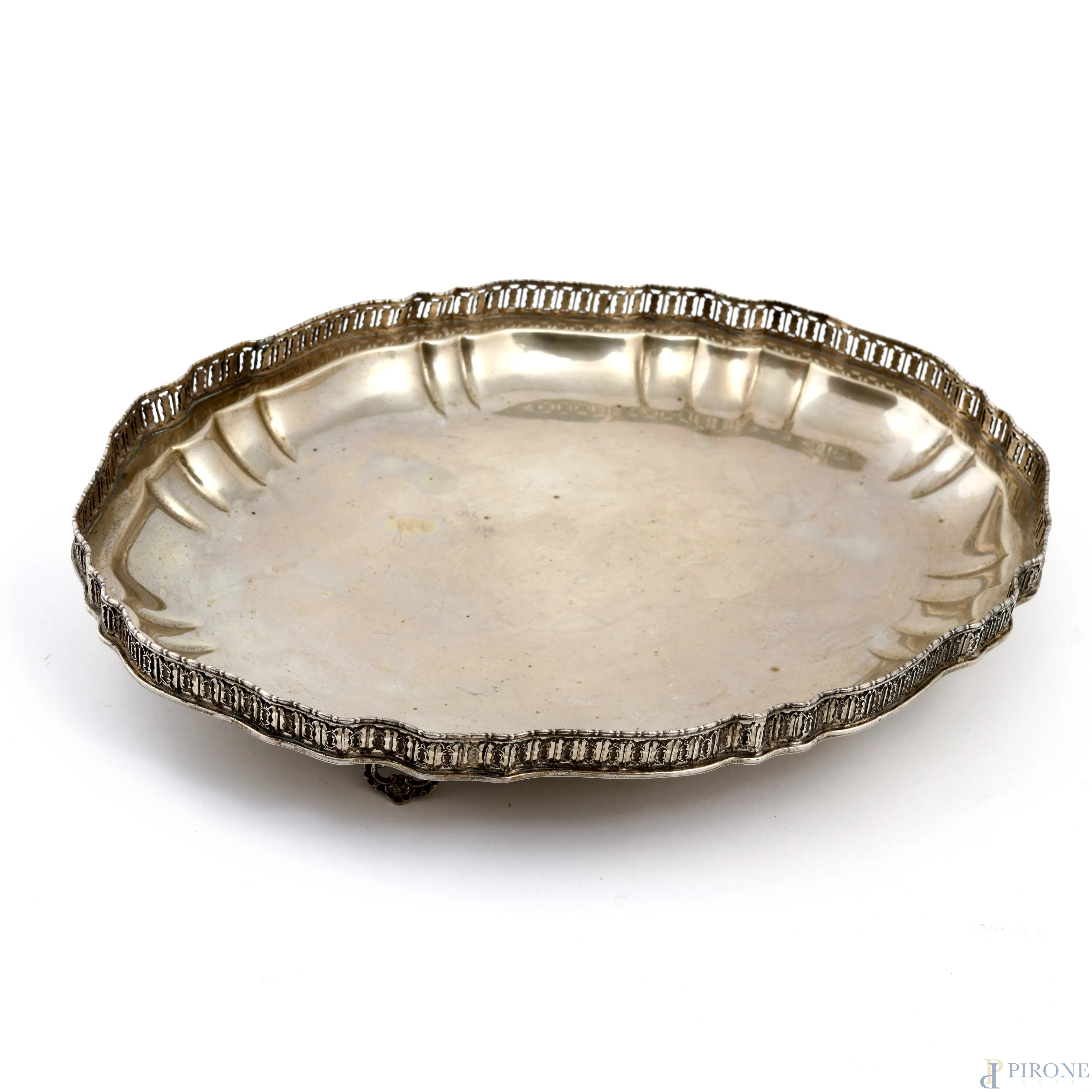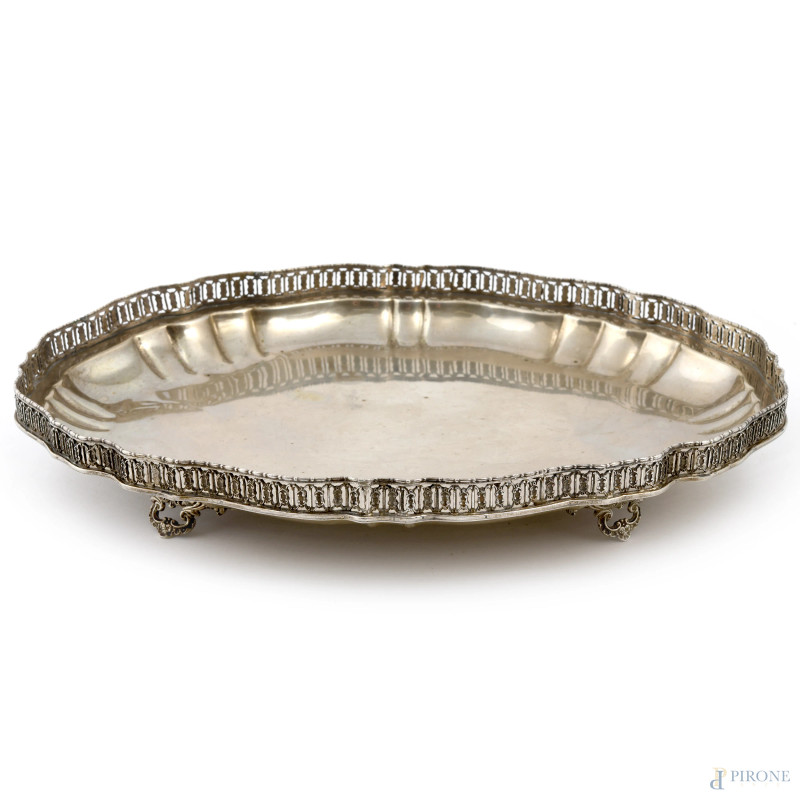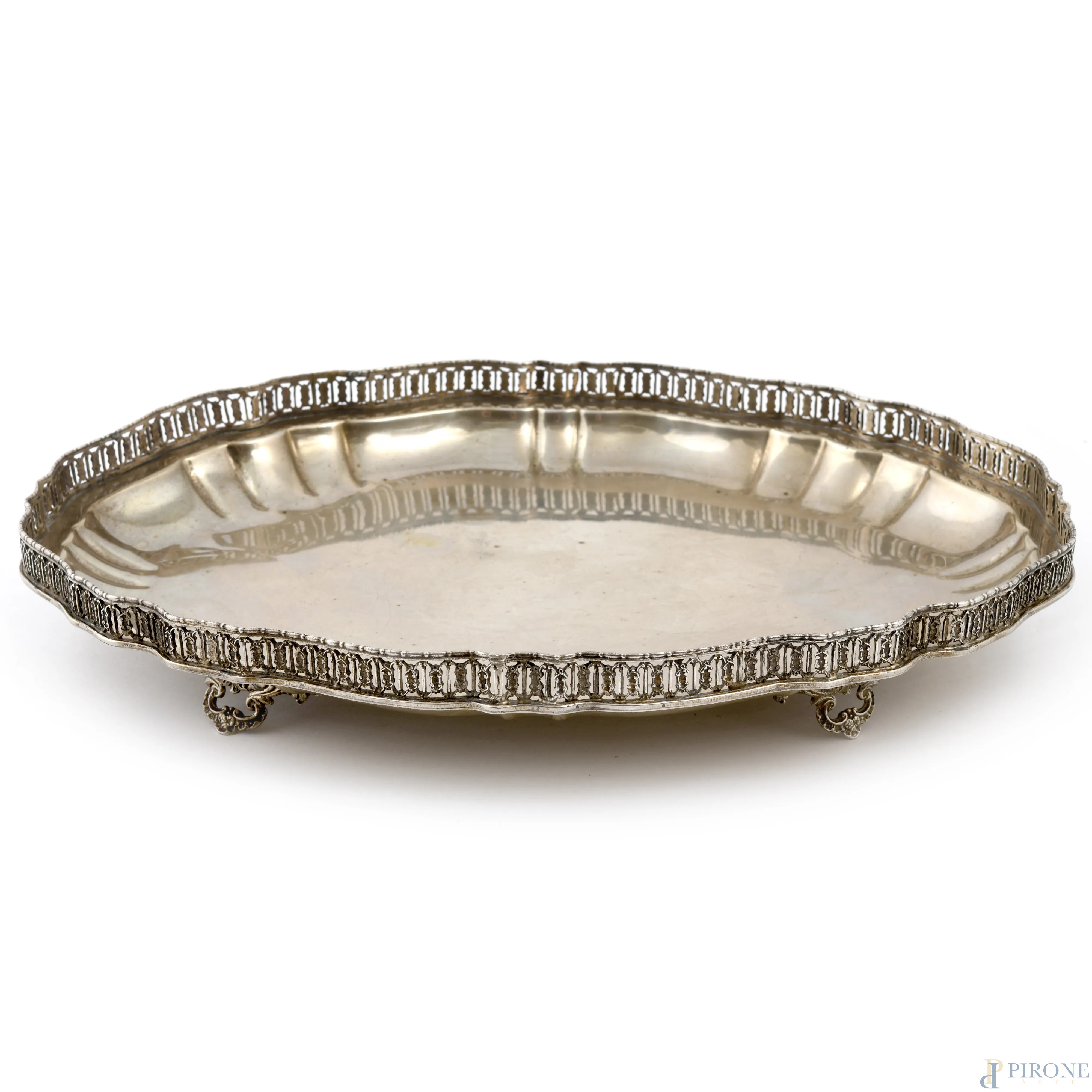 Alzata centrotavola ovale in argento 800/000 lavorato a mano con quattro piedini e lavorazione al bordo, cm 6x36,5x27 peso gr 750