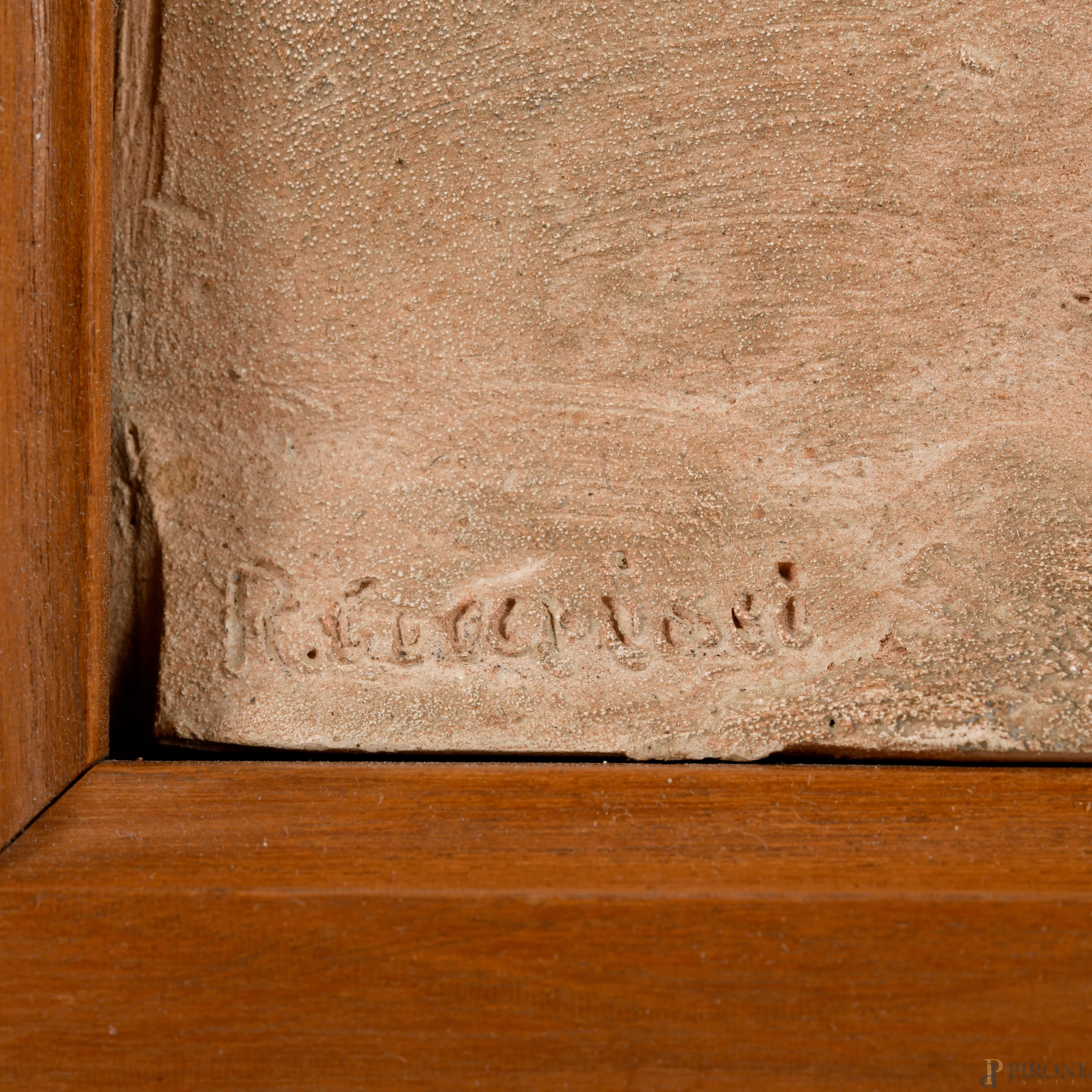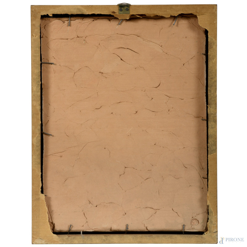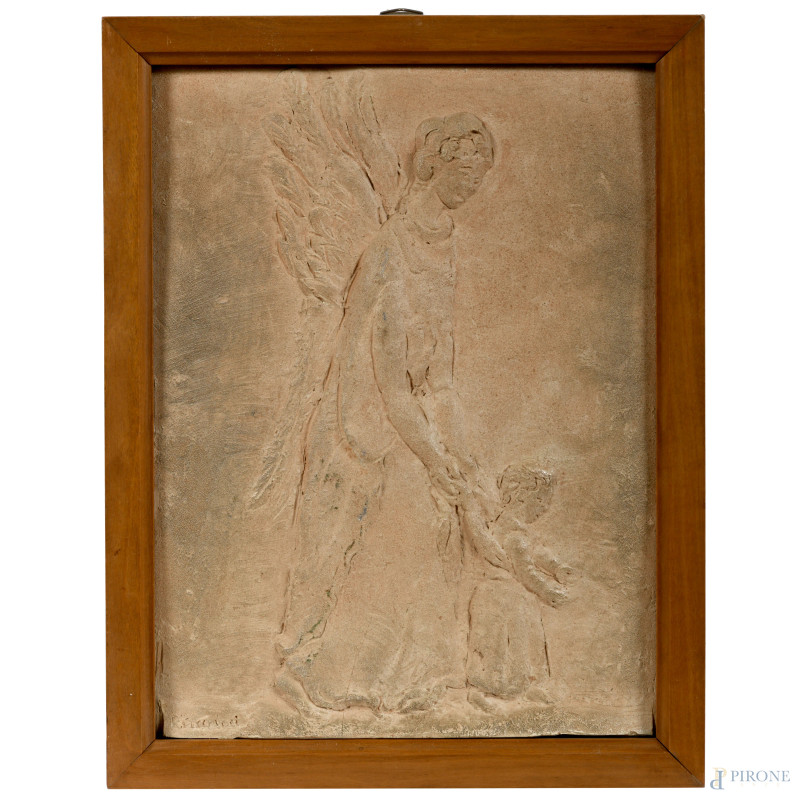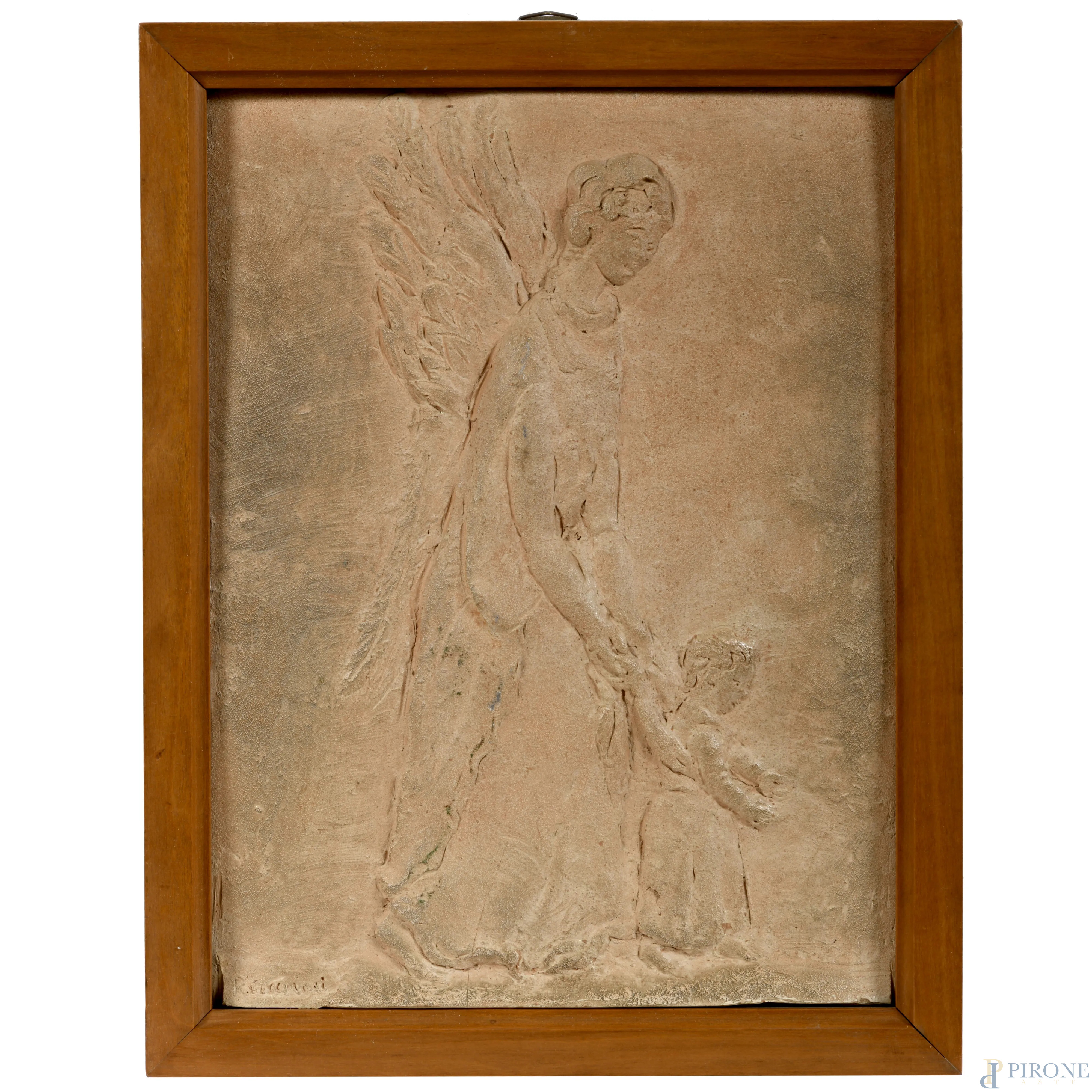 Angelo custode, XX secolo, bassorilievo in terracotta, cm 27,5x21,5,firmato in basso a sinistra, entro cornice, (difetti)