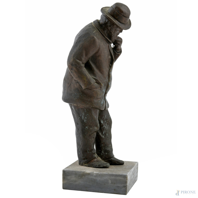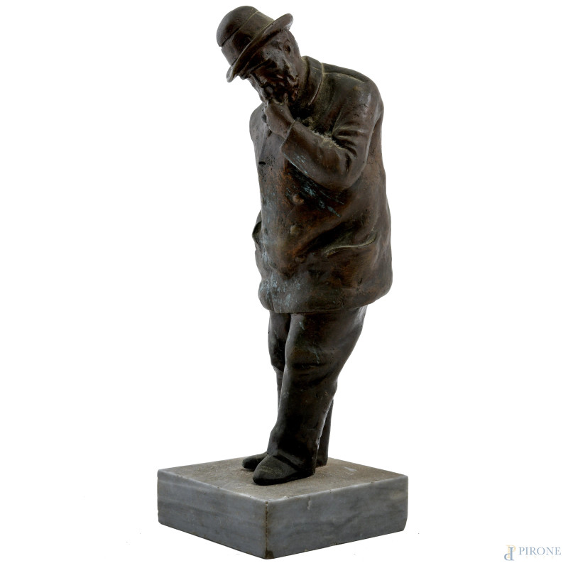 Anziano con cappello, scultura in bronzo su base in marmo, XX secolo, altezza complessiva cm 29 (segni di usura)