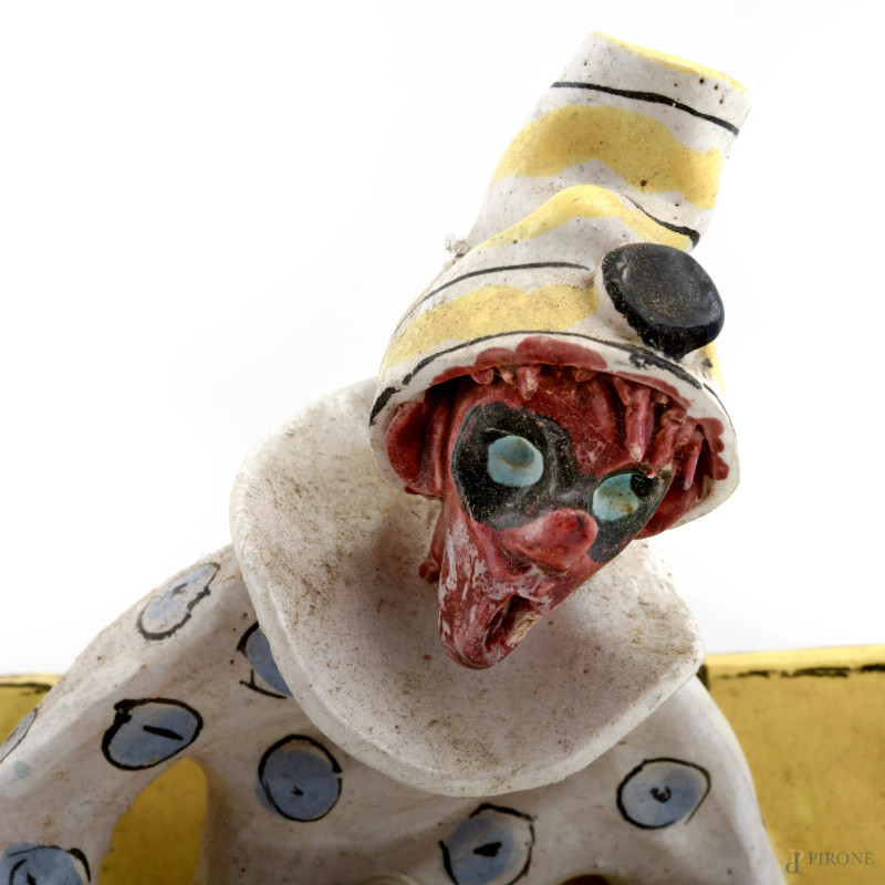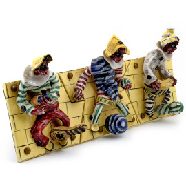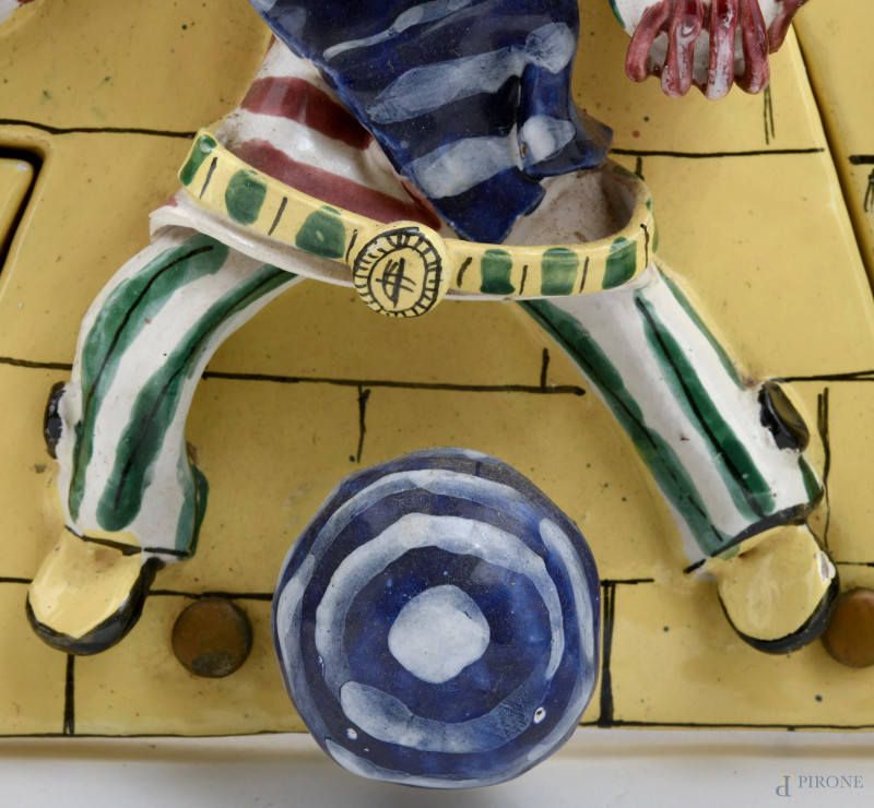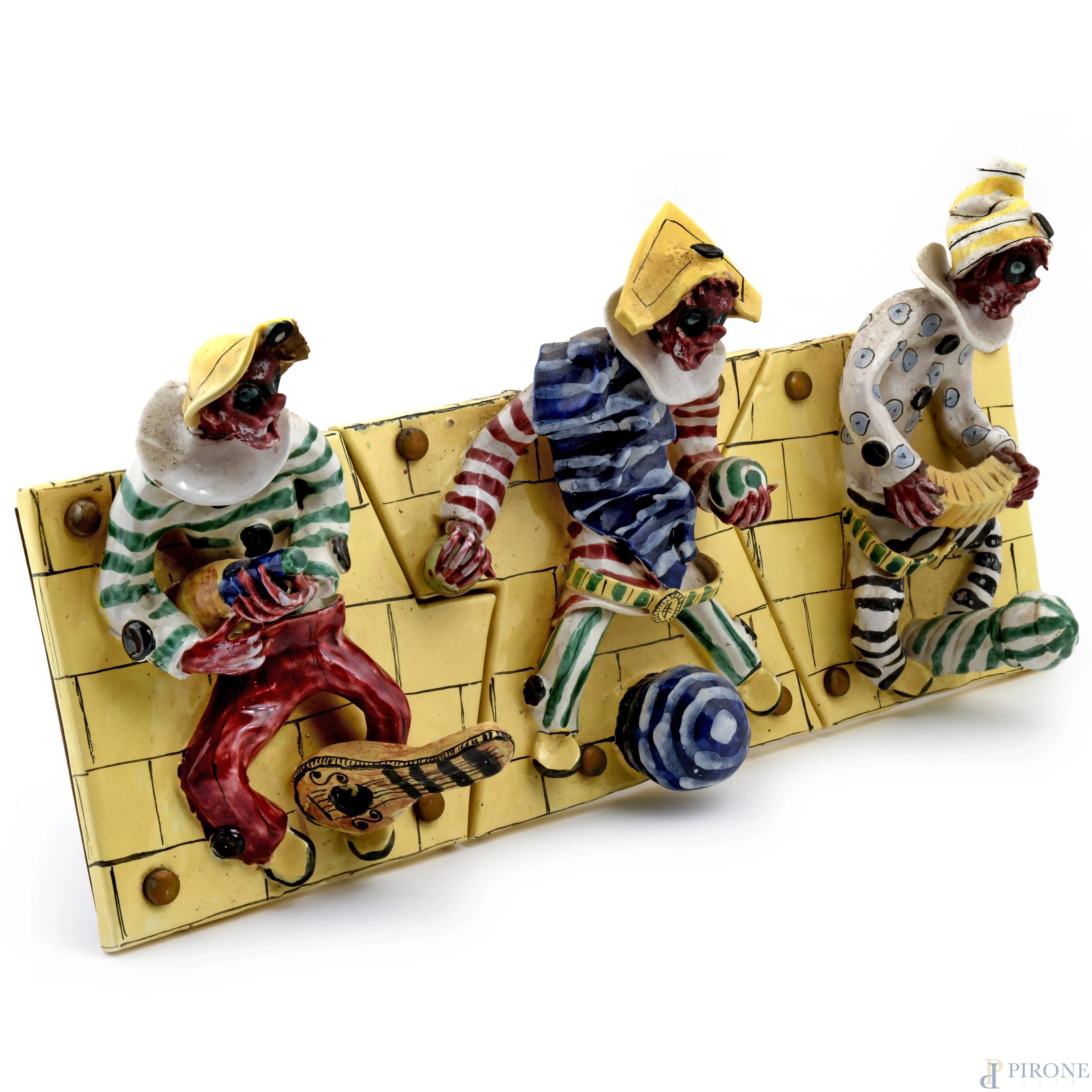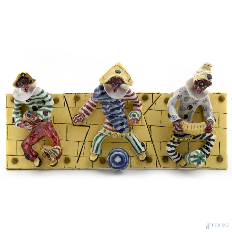 Attaccapanni in ceramica dipinta con arlecchini, XX secolo, cm 55x27x1, (segni di usura, difetti)