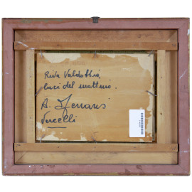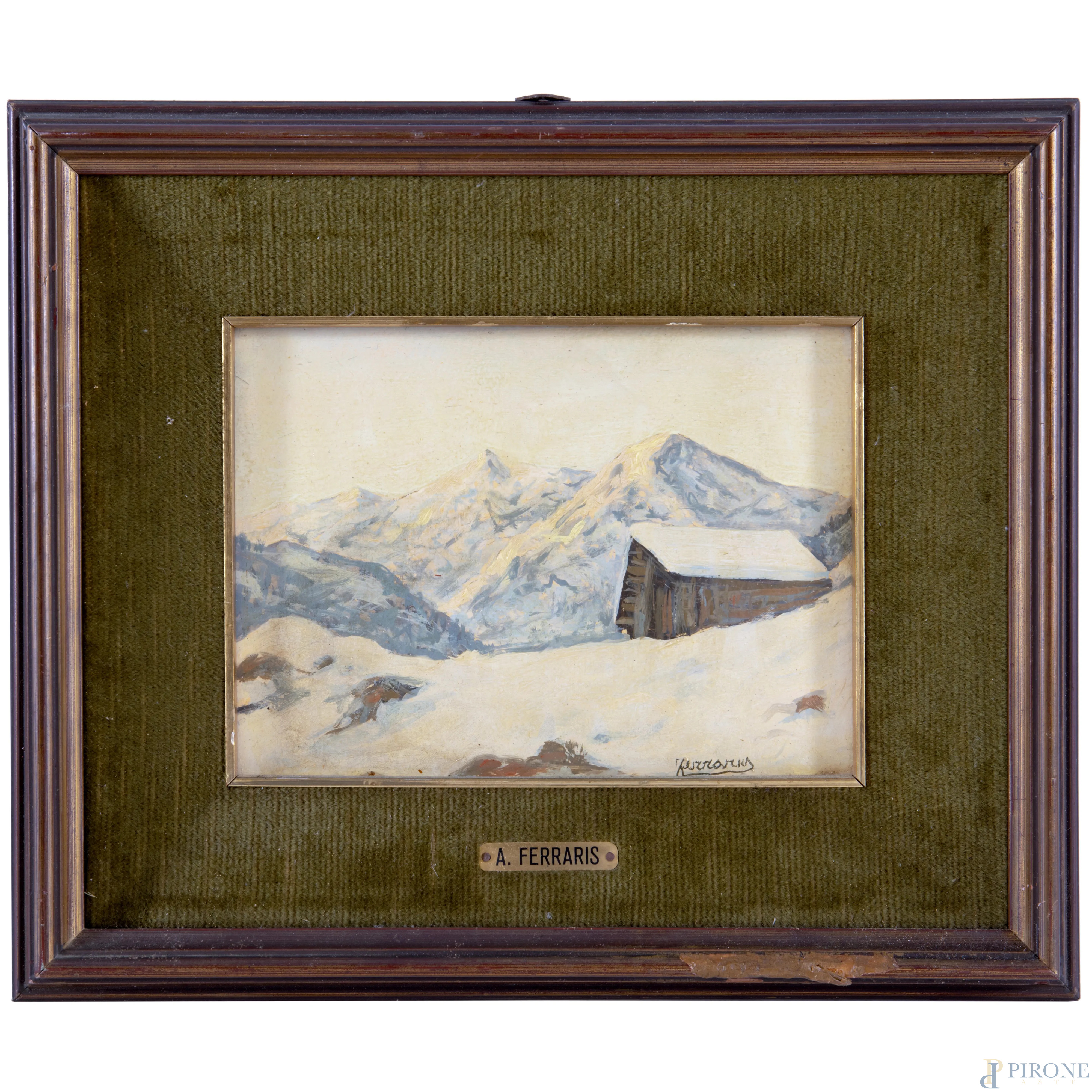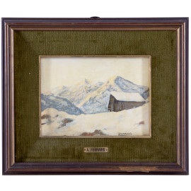 Baita tra i monti innevati, XX secolo, olio su compensato, cm 18x24, firmato in basso a destra, entro cornice