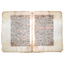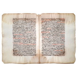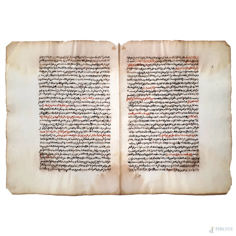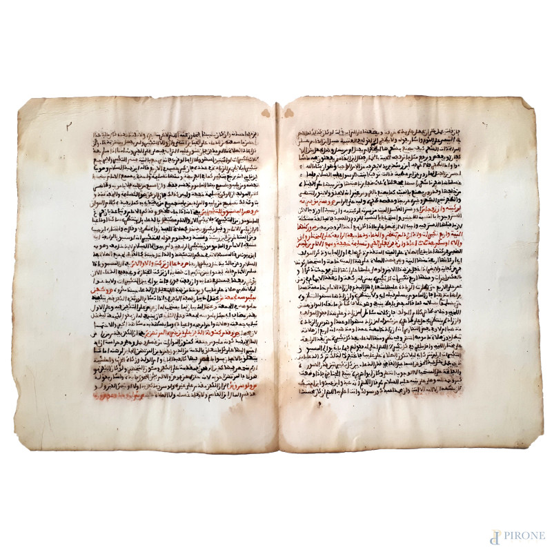 Bifolio manoscritto in lingua persiana in stile “Nasta’liq” in un foglio proveniente da tomo Persiano degli inizi dell’Ottocento, testo vergato con inchiostro bruno e alcune righe con inchiostro rosso, segni del tempo, cm 29x43