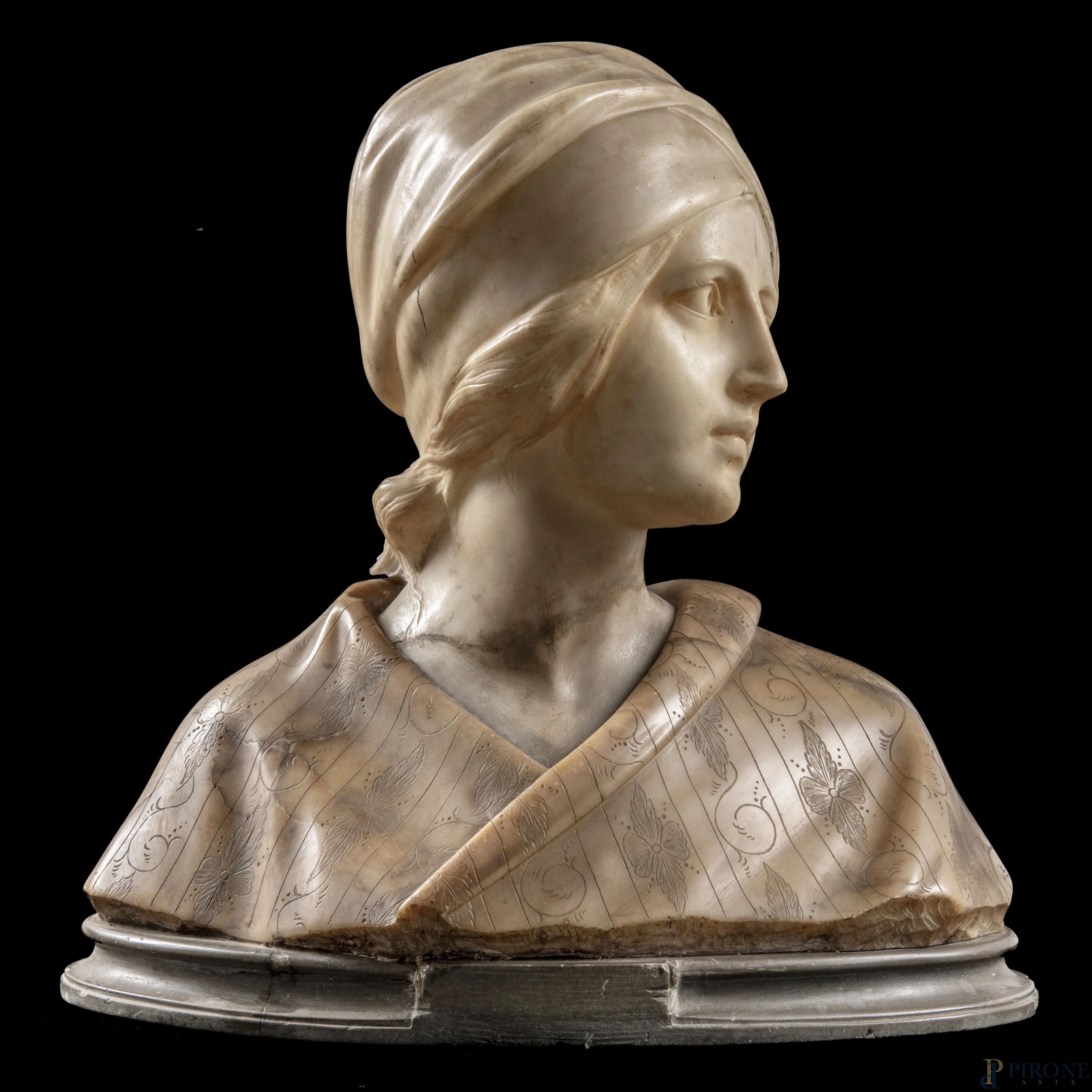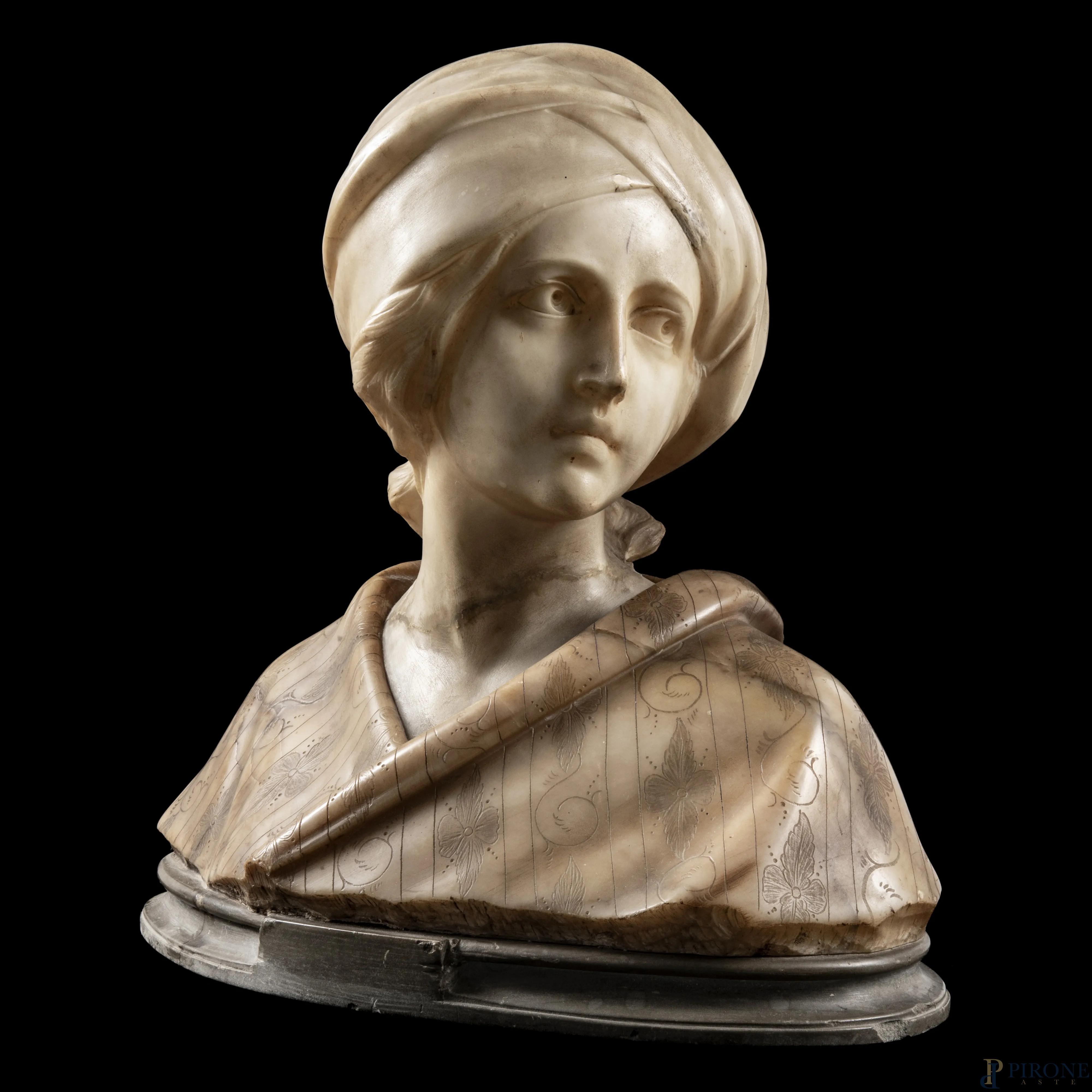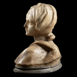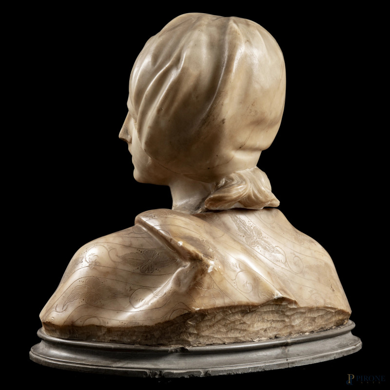 Busto di fanciulla, XX secolo, scultura in marmo, altezza cm 35, (scalfiture, rotture, mancanze, restauri)