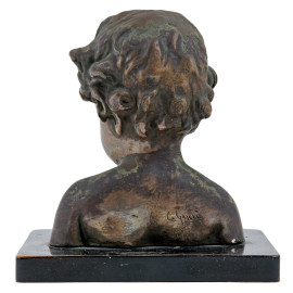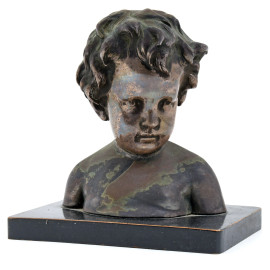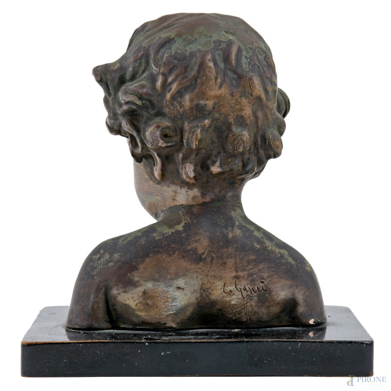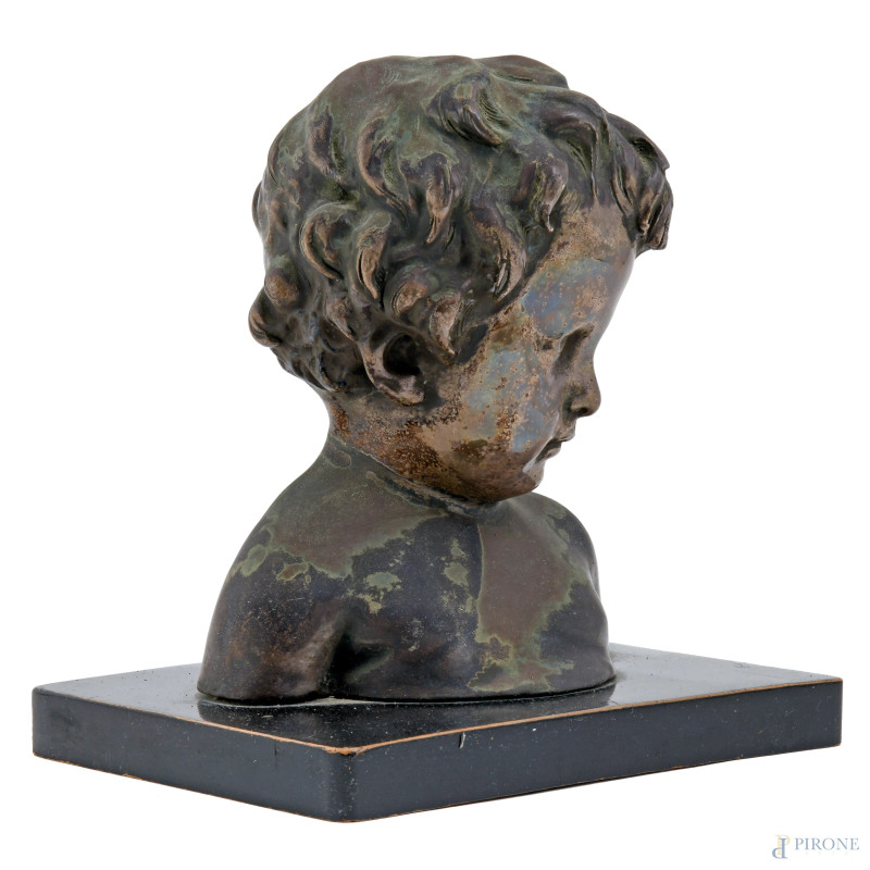 Busto di fanciullo, scultura in metallo argentato su base in legno dipinto, altezza cm 20, firmato al retro