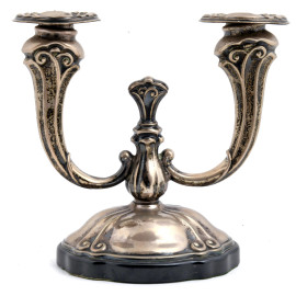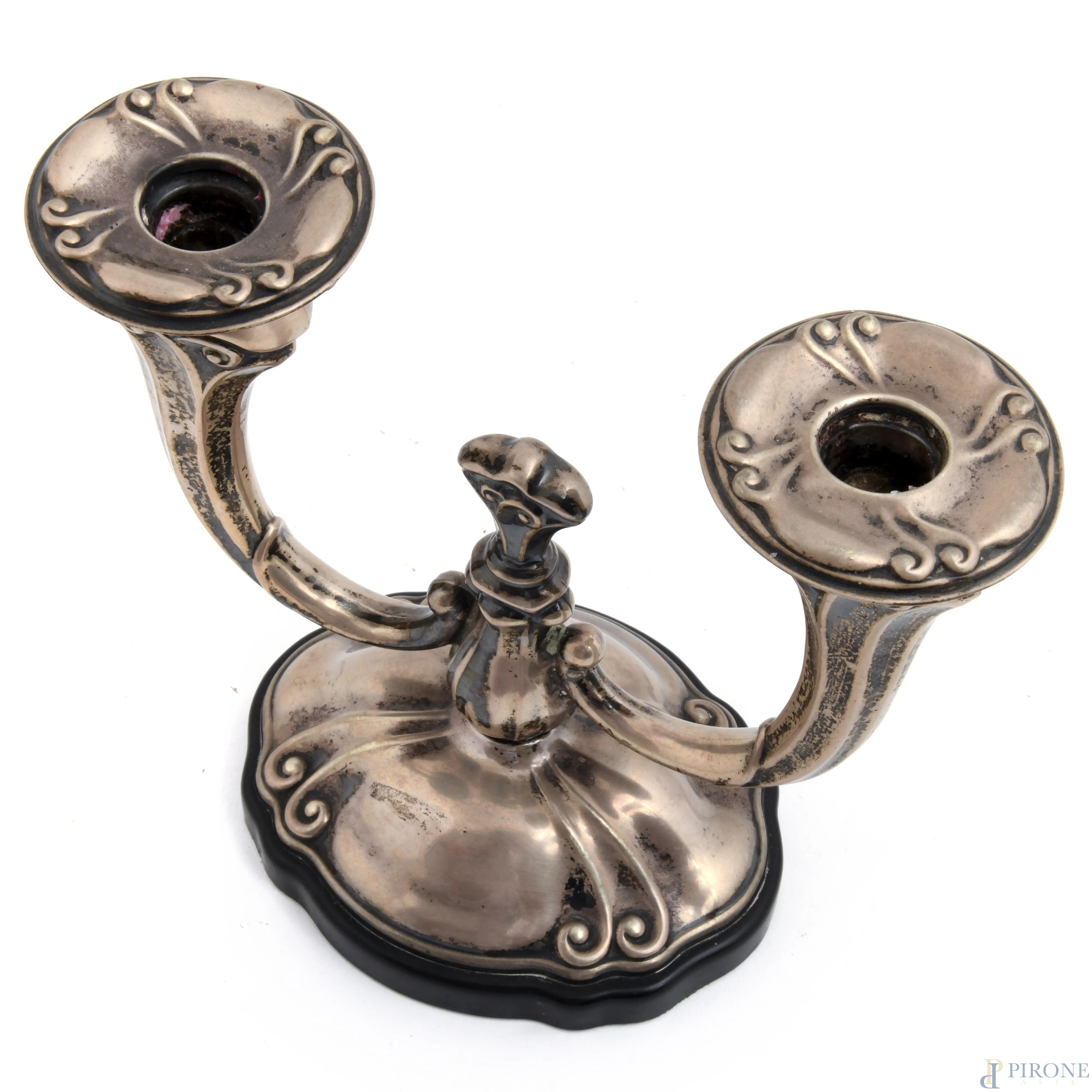 Candelabro a due bracci in argento 800/000, cm 18,5x19,5x11, peso lordo gr 410, (segni di usura)